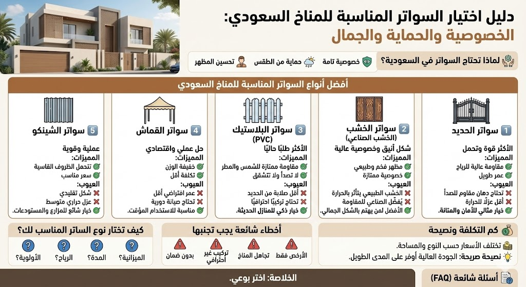 في المملكة العربية السعودية لم تعد السواتر مجرد عنصر تكميلي، بل أصبحت حلًا أساسيًا لـ الخصوصية، الحماية، وتحسين الشكل العام للمنازل والاستراحات والمنشآت. لكن اختيار النوع الخاطئ يعني تلف سريع وتكاليف إضافية. في هذا الدليل نضع بين يديك أفضل أنواع السواتر المناسبة للمناخ السعودي، بدون تسويق فارغ.